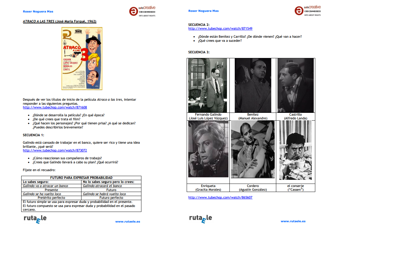 La película es una sátira de la sociedad española de los años 50. Landa tiene un papel secundario, pero brillante. La película narra con humor negro el plan y la ejecución de un atraco en una sucursal bancaria. La actividad de ELE, diseñada para B2, consiste en ver algunas secuencias de la película e ir adivinando qué ocurrirá (futuro de probabilidad). Corté las escenas que me interesaban para desarrollar la tarea con el programa Tubechop.