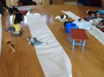 Hoy voy a mi clase de amariña emocionada porque empiezo la fase 1B y, después de 50 horas de clase, se nos va a permitir hablar. Tengo mucha curiosidad como estudiante y como profesora de lengua extranjera. La profesora nos pide que conjuguemos los verbos en presente «continuo», ¡pero si no sabemos! Nos da las tarjetas de los pronombres y ella conjuga el verbo «limpiar» con todos los pronombres. Luego nos toca a cada una conjugar algunos de los verbos que hemos aprendido en la fase 1, no vale apuntar las terminaciones. A continuación esparce varios objetos por la mesa: los muñecos de trapo, los muebles de la casa de muñecas, las frutas y verduras, los cacharros de cocina, los animales, tarjetas de colores, etc. y divide la mesa en tres espacios. Empezamos por turnos a decir una frase, yo digo «elote (maíz) amarillo» y lo pongo en el nivel 1. Luego la compañera añade «la vaca se come el elote amarillo» (el elotito pasa al nivel 2 y la vaca se queda en el nivel 1). La tercera compañera agrega nuevos elementos: «la vaca que come elote está al lado del elefante» (la vaca pasa al nivel 2, el elote sale del juego y entra el elefante al nivel 1). Cuarta compañera: «la vaca está caminando al lado del elefante y va a la puerta» (la vaca sale del juego, el elefante pasa a nivel 2, la puerta entra en nivel 1), etc. A medida que usas una palabra, sube de nivel. Cuando has usado tres veces la palabra se elimina. Puedes escoger cualquier objeto de la mesa. Me ha parecido un ejercicio bastante práctico y divertido para conjugar los verbos que sabemos y practicar las preposiciones y los colores, algunas frases eran muy ingeniosas como «el ratón tiene hambre y se come al elefante gris» aunque no sé si aplicable a la vida fuera del aula 🙂 En el tercer y cuarto periodo hemos dividido la clase en dos grupos (2 y 2) y la profesora ha repartido 20 tarjetas con dibujos muy parecidos a cada grupo. Teníamos que escoger una tarjeta y describirla para que el otro grupo adivinase de qué imagen se trataba, tipo «hay cuatro caballos, hay una casa que tiene cuatro ventanas, hay un niño al lado del árbol y una niña entre el camino y la flor, no hay sol, etc.». Buen ejercicio para practicar hay/ no hay y las preposiciones. Hay una actividad parecida en ELE 1 de Virgilio Borobio, SM, con 6 dibujos de alimentos para practicar haber impersonal y las medidas y envases (hay una barra de pan, hay un paquete de azúcar, hay una docena de huevos, etc.). Al salir de la clase practico con Thomas, «el perro está detrás de la casa», «yo no tengo coche, tú tienes coche, nosotros queremos coche» (todavía no sé decir comprar) ¡Estoy hablando en amariña! 🙂